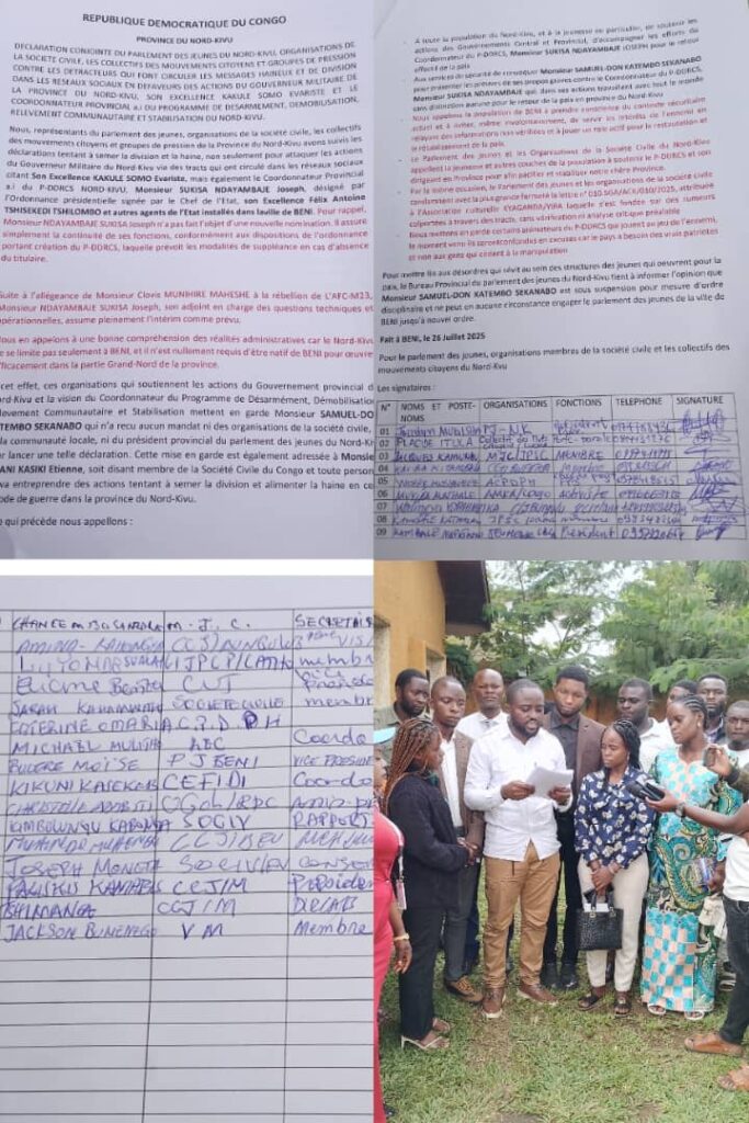 Dans une déclaration rendue publique samedi 26 juillet 2025 à Beni chef-lieu provisoire de la province du Nord-Kivu, ces organisations mettent en garde Samuel Do Sekanabo qui aurait ténu des propos pleins des messages tribaux qualifiant le coordonnateur provincial ad intérim du PDDRC-S Sukisa Ndayambaje Joseph de rwandais et ancien FDLR. Les jeunes estiment que ces propos visent à briser la cohabitation pacifique et la cohésion sociale entre les habitants dans la province du Nord-Kivu. Tout en condamnant les propos de Samuel do Sekanabo et en lui mettant en garde, cette jeunesse précise que Sukisa Ndayambaje Joseph est dans la continuité de son travail.
